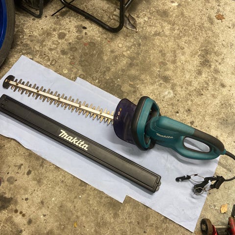 Makita UH4500 sähköinen pensasleikkuri, jossa 450 mm leikkuuterä. Sopii pensasaitojen ja pensaiden leikkaamiseen.