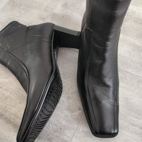 Naiset mustat nahkasaappaat, koko 38. Saappaissa on musta nahkamateriaali ja ne ovat varrelliset. Sisävuori on lämmin ja saappaissa on vetoketju sivulla helpottamassa pukemista.