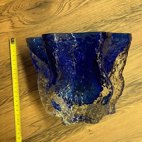 Sininen maljakko. Kumelan lasi Liepukka design Kaj Blomqvist. Ehjä.