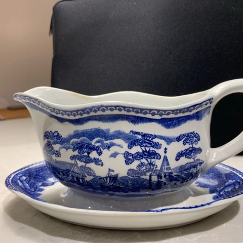 Arabia kastikekulho ja aluslautanen. Pituus 19 cm, leveys 13,5 cm.