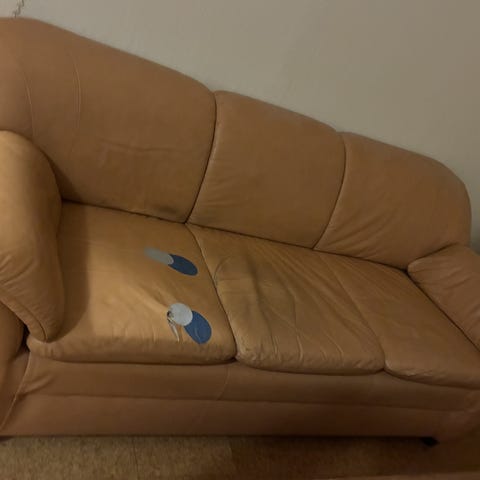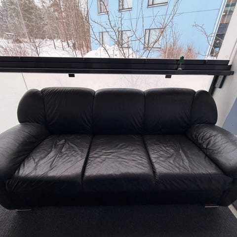 Annetaan 2-istuttava nahkasohva. Istuinosassa sauma ratkennut. Muuten hyvä. Nopeimmalle noutajalle. Ei eläintalous.