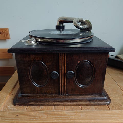 Vanha matkamallin gramofoni. Pyörii ja toimii veivistä. 60e/tarjoa