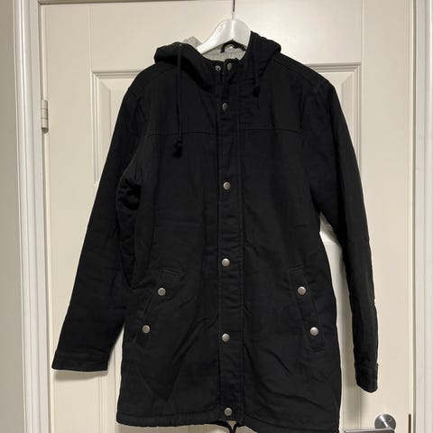 Black fabric winter coat, bought from Stadium quite a long time ago, has been unused for a few years. Size M, I would guess it fits someone about 170-180 cm tall. Pockets, zippers, and snap fasteners are intact. The main zipper opens in both directions. There is one breast pocket on the inside with a zipper, 4 snap pockets on the outside, and 2 open pockets for keeping hands warm. Has been in a cat and dog household, but not in a few years. Preferably pickup, I can also bring it, for example, to Prisma Linnanmaa.