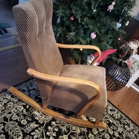 Vanha keinutuoli yksi käsinoja pitää limatta, muuten hyvä istua kuivassa homeettomassa talossa