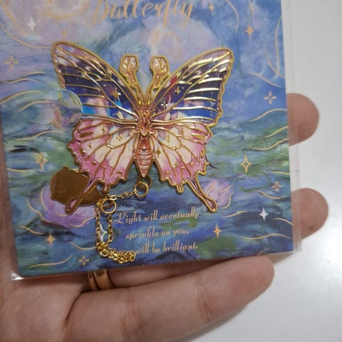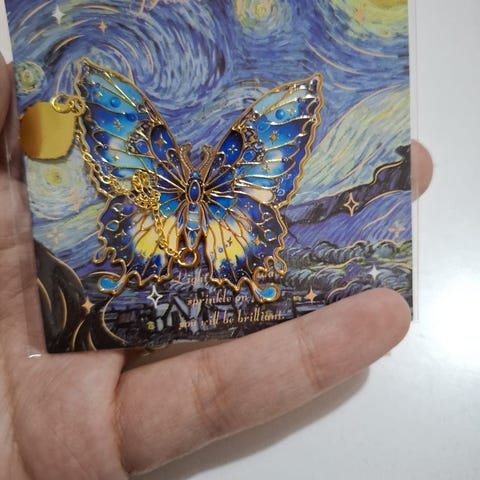 M”-Metal butterfly bookmarks with golden hollow pattern and oil painting motif, includes pendant chain