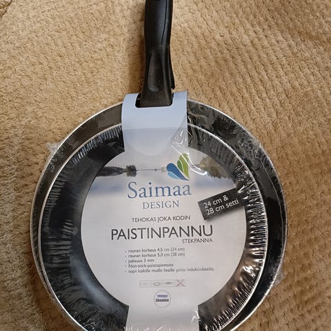 Uudet Saimaa Design paistinpannut, ø 14 cm,2 kpl. Reunan korkeus 3 cm, keraaminen pinnoite, bakeliittikahva, spiraalipohja. Ei sovellu induktio liedelle. (kuva2.). Hinta 5e/kpl. Nouto
