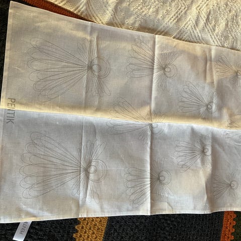 Pentikin uusi, lapullinen keittiöpyyhe, Manteli kuosilla. 50/50 pellavapuuvillaa, vaaleanpunaisia ja kanelin värisiä manteleita luonnonvalkoisella pohjalla, koko 47x70cm