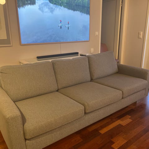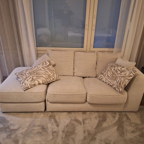 Jysk Allesse sohva vasemmanpuoleinen. Parissa kohtaa purkautumisen alkua. Ei erityisen likainen mutta pesemällä saisi varmaan paremmaksikin. Koiratalous mutta allergiavapaa koira.