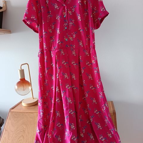 Hyväkuntoinen kukkamekko, jossa pliseerattu alaosa. Koko noin 42. Kai-kai 54 cm, vyötärö joustava 64-86 cm ja olka-helma 113 cm. Pienet pussihihat, joissa yhden napin kiinnitys.