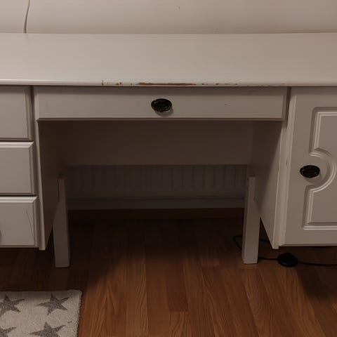 Retro-tyylinen kulmapöytä, valmistettu puusta. Pöydässä on kaksi laatikostoa ja mustat metallijalat. Sopii työ- tai kirjoituspöydäksi.
