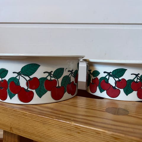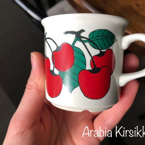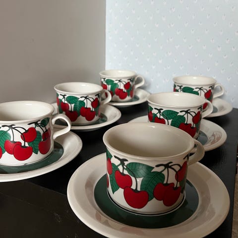 Arabia Kirsikka astiasto sisältää 6kpl kupit ja tassit. 4kpl tarjoilulautasia, sokerikon ja kermakannun. Kahdessa kupissa ja yhdessä tassissa pieni lohkeama