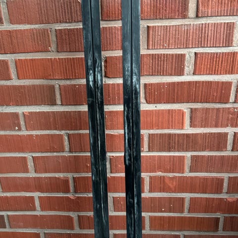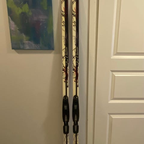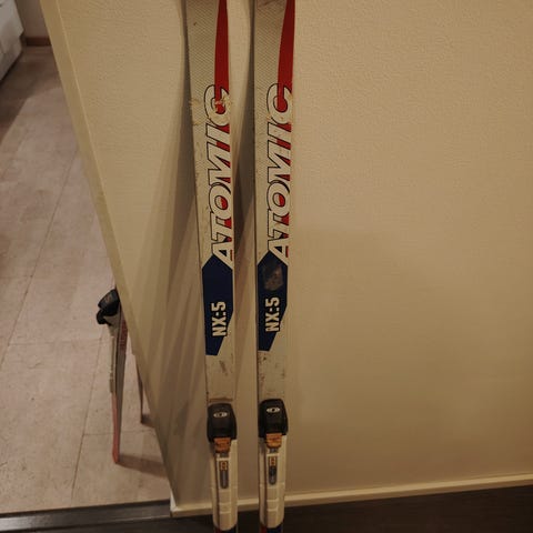 Ylimääräiseksi jääneet perinteisen tyylin sukset. Noin 55-60 kg painoiselle. Suksien pituus noin 187 cm.