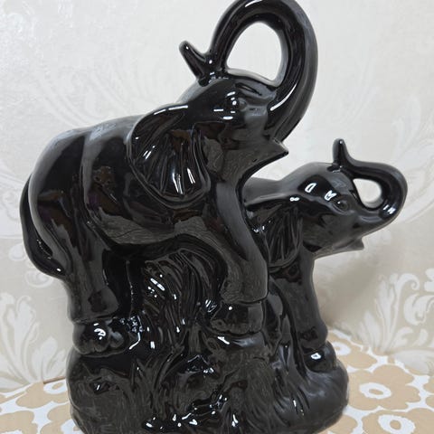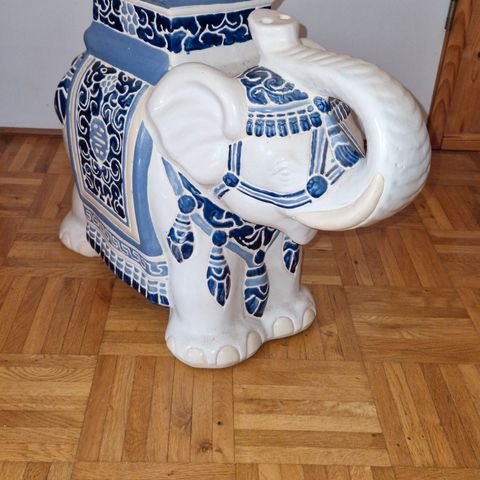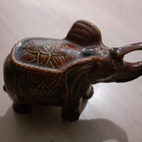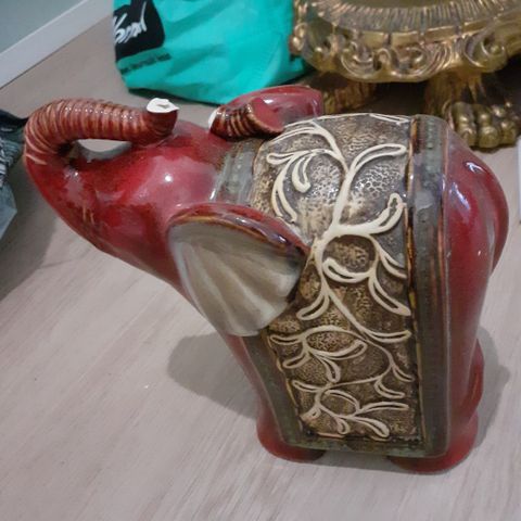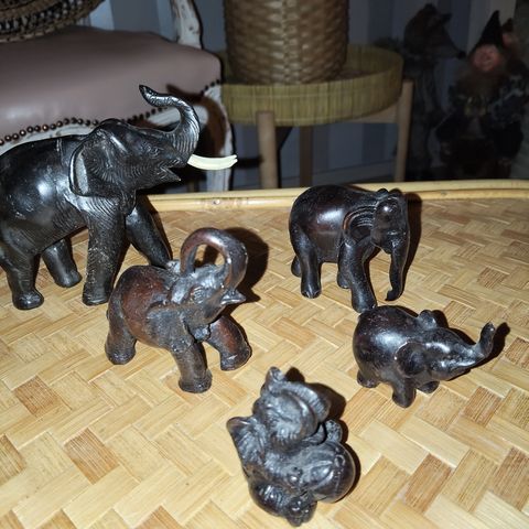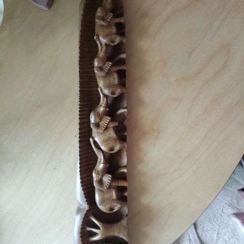 Puinen norsu jonka selässä olevassa korissa 6 puista lasin alusta. Korkeus Kunto erittäin, on ollut vain koristeena ei käytössä.