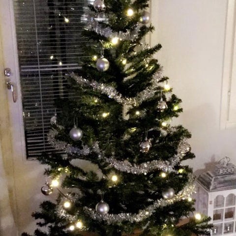 Myydään kuvassa näkyvä puinen kuusi joulupalloilla.