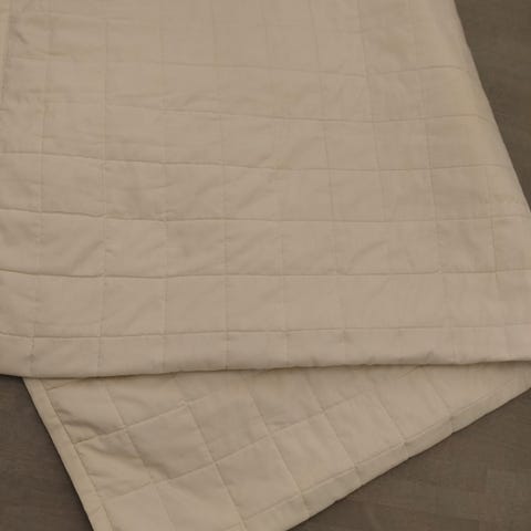 Hyvässä kunnossa oleva harmaa päiväpeitto.