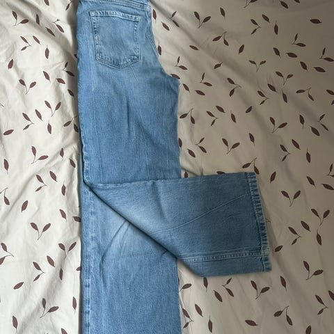 Myydään yhdellä lapsella olleet housut. Ehjät. Vyötäröllä on sisäpuolella kuminauhakiristys. Farkuista on lähtenyt pesussa vähän väriä. Mutta on vielä käyttökelpoiset.