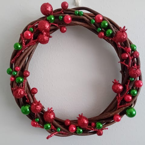 Myydään uusi jouluinen kaunis kranssi. Marjat valkoiset. Materiaali vaneria. Halkaisija 28cm. Haku Niinivaaralta.