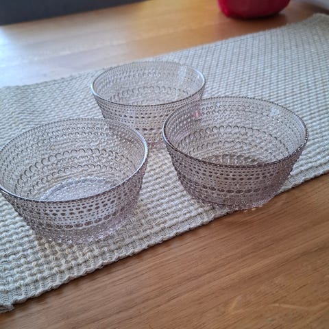 Kirkkaita kuppeja on 11 , lautasia 4 ja yksi turkoosi kuppi. Yhden kupin hinta on 10 € ja lautasen 5 €.