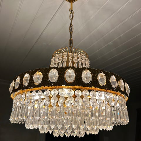 Varattu/Valaisimessa kolme kupua, joissa 24 karaatin kultaus. Kaikki kristallit ovat tallessa. Koko 10x10cm. Kuvassa valaisimen ketju noin 107 cm, mutta jatkovaraa on kuten kuvassa näkyy. Valaisinta ei ole puhdistettu eikä kiillotettu pitkään aikaan. Myyntiin suoraan käytöstä.