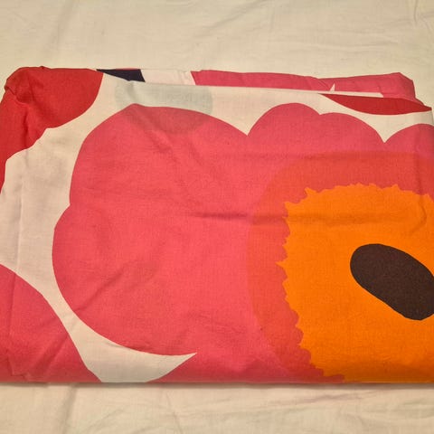 Myynnissä uusi ja avaamaton Marimekko Unikko -pussilakanasetti kauniissa beigen sävyssä.