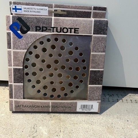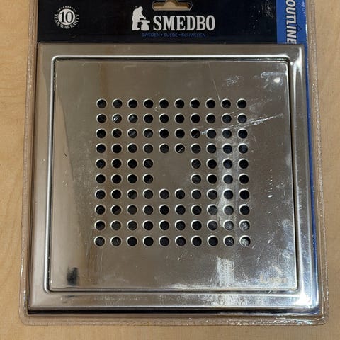 Uusi käyttämätön (paketti avattu) mattamusta Smedbo lattiakaivonkansi 200 x 200 mm ja kokonaiskorkeus 5,5 mm.