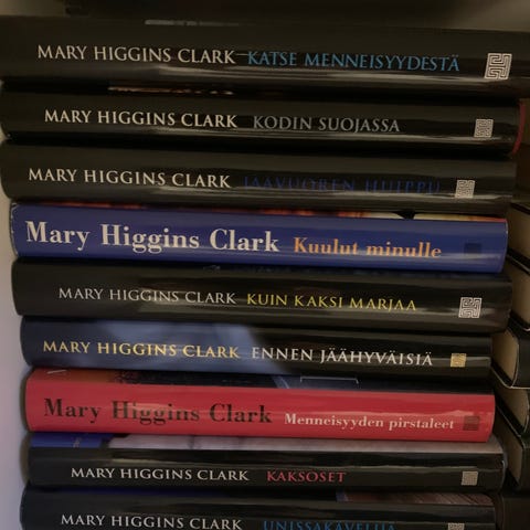 Mary Higgins Clark kirjojen kokoelma, sisältää neljä erilaista kirjaa. Kirjat ovat suomenkielisiä, eri kansikuvilla, painetut kovakantisina ja pehmeäkantisina. Sopivat lukemiseen ja kirjallisuuden harrastamiseen.