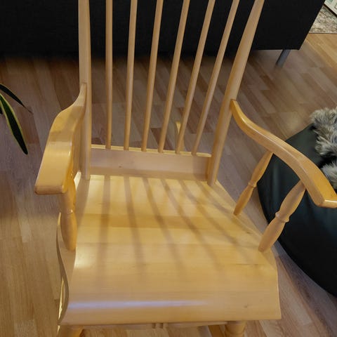 Metallijalkainen keinutuoli. Sininen kangas. Oliskohan Vekestä hankittu.