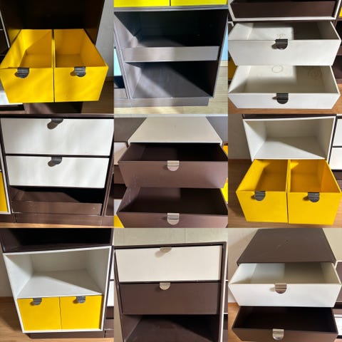Ristomatti Ratian vuonna 1972 suunnittelema modulaarinen Palaset -laatikko, muovia. Kaksi reunaa maalattu kiiltävän mustaksi (muuten ruskea) mutta osana isompaa kokonaisuutta ei haittanne. Haku Helsingin Kalliosta