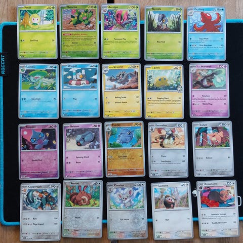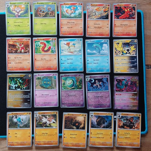 Myydään Scarlet & Violet base set Pokemon kortteja 20kpl. Hinta yhteensä 10e tai yksittäin ostettuna hinnat alla.