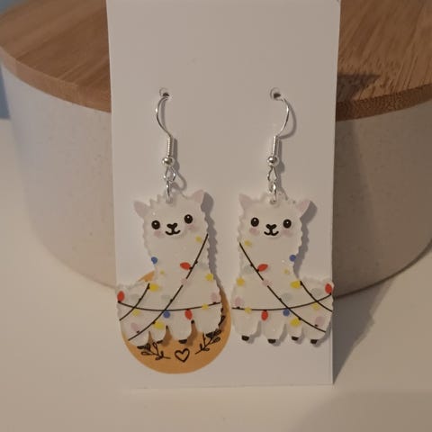Myydään hyväkuntoisia jouluisia laama/alpakka korviksia. Koukut ei sisällä nikkeliä.