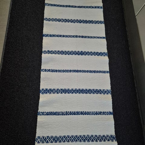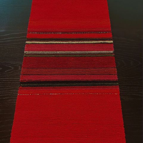 Taidokkaasti tehty poppanakäsityö. Mitat 39 × 88,5 cm + hapsut. Siistissä kunnossa.