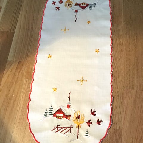 Hieno ohut kantattu ja päistä hapsutettu, koko noin 190x24cm, voi käyttää molemmin puolin on vastavärit puolilla. tai keksiä muuta käyttöä, vaikka joulunäytelmään. kaulaliinaksikin käy joulun henkeen.
