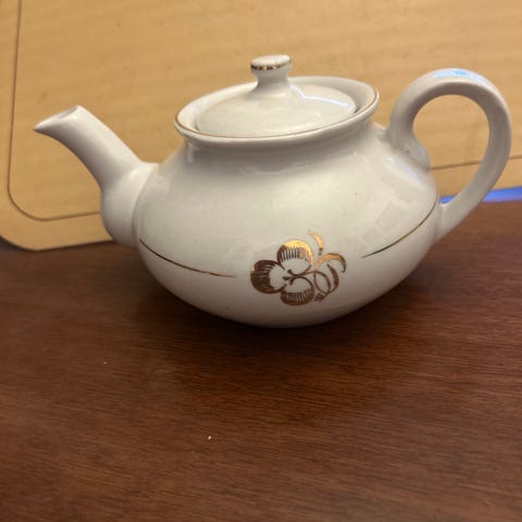 Arabia teekannu, jossa on kukkakuviot. Posliinimateriaali. Käytetty kunto, kannessa teipit, jotta se ei häviä. Nokassa vikaa.