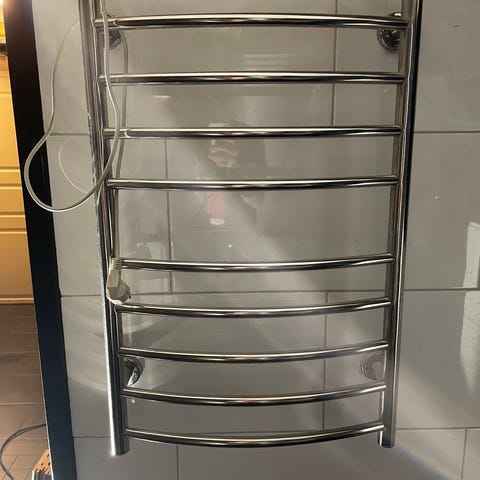Metallinen pyyhekuivain seinämalli, jossa on vaakasuorat putket ja kiinnitystelineet. Soveltuu pyyhkeiden kuivaamiseen ja lämmitykseen kylpyhuoneessa tai muissa tiloissa.