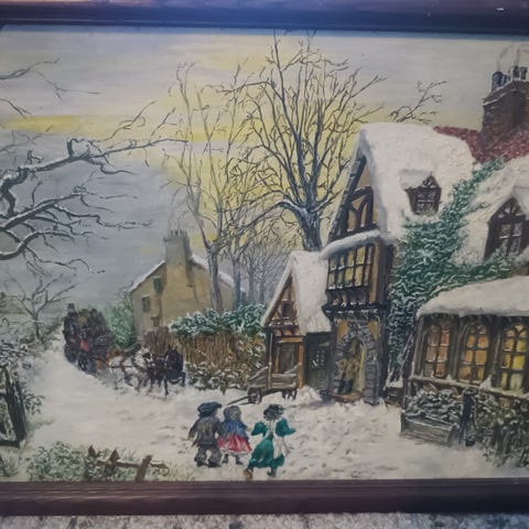 "Kylli-tädin" - Kylli Kosken jouluinen vesivärityö. Ostettu suoraan taiteilijalta. Taulun koko leveys 18,5cm ja korkeus 23,5cm. Vesivärityön koko taulussa 10cm x 14cm.