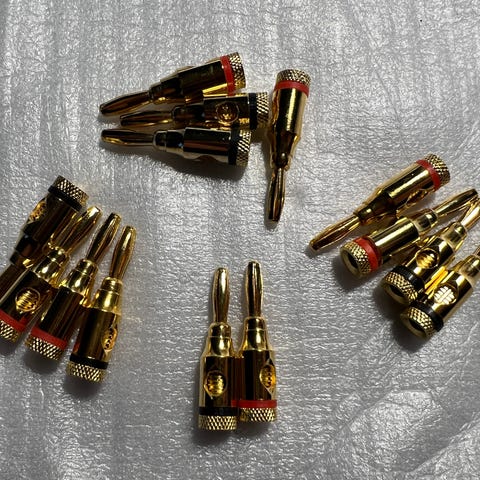 Uudet 4 mm kullatut banaaniliittimet 4+4 kpl. Pituus 40 mm, halkaisija 9 mm, liitinosan pituus 14 mm, johdon aukko n. 5 mm.