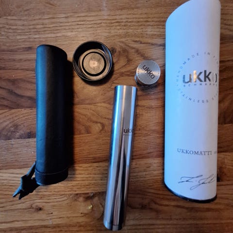 Ukko Finland design lihanuija/taskumatti. Pari kertaa käytetty, kuin uusi. Säiliöön voi laittaa mausteita, öljyä tai vaikka juotavaa.