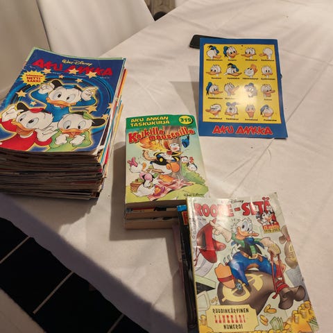 Kunto hyvä tai kohtalainen. Aku Ankka kirjoja 6 kpl. Roope-Setää; 2 Platina kirjaa ja muita 5 kpl. Vain nouto. Voidaan toimittaa myös Valkeakoskelle.