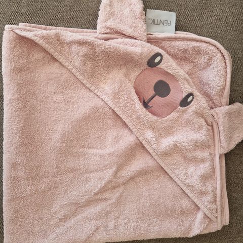 Uutena meille tullut ja yhdellä vauvalla satunnaisesti käytetty huppupyyhe. Pesussa jo hieman karheentunut, mutta ehjä ja siisti.