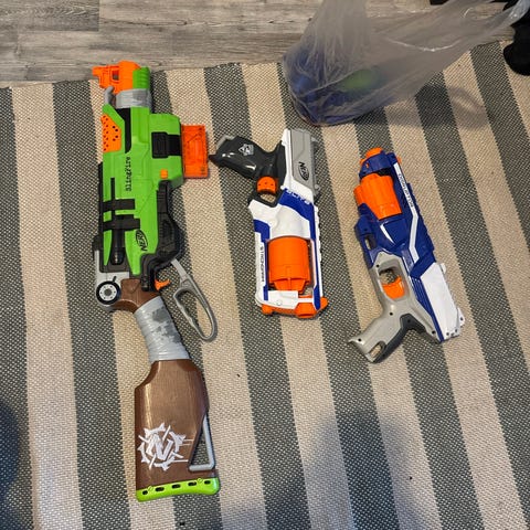 Nerf lasten leluaseet sisältäen useita eri malleja ja värejä. Aseet on valmistettu muovista ja ne on suunniteltu lasten käyttöön. Sarjaan kuuluu erilaisia leluaseita, jotka sopivat leikkeihin ja harjoitteluun. Myös muita leikkiaseita. Kaikki yhteishintaan