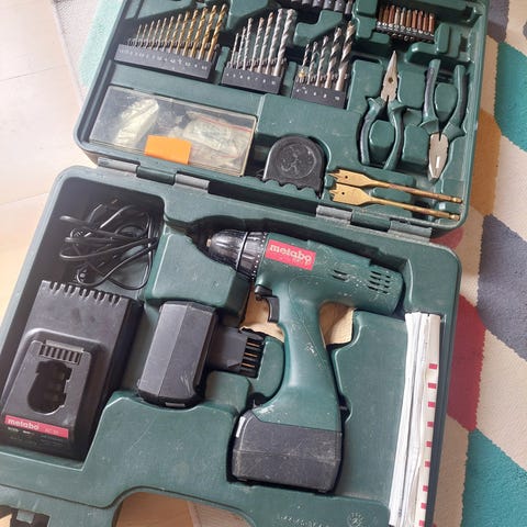 Tässä on siisti ja ammattimainen Metabo BS 14.4 LI akkukäyttöinen porakone. Mukana on 2x 14.4 voltin akkua, latauslaite ja käyttöohjeet. Lisäksi kärkiä istukan kanssa. Laite on myös melko kevyt.