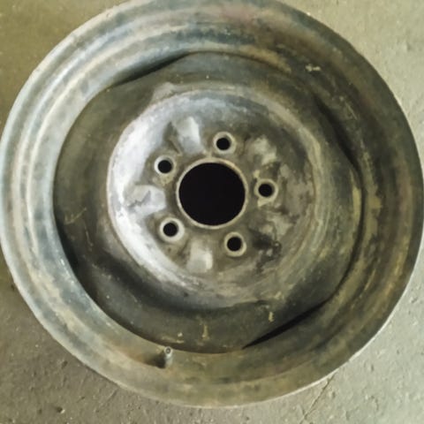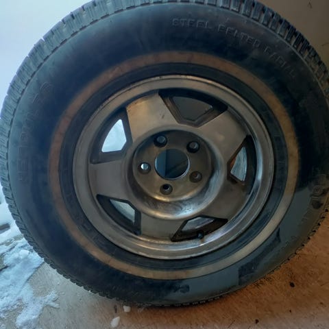 4 kpl ruosteiset vanteet, ehkä Chevy Astro , ikivanhoilla C nastarenkailla , 2 rengasta ok ja