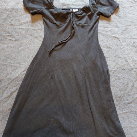 Raidallinen mekko. Kauniisti laskeutuva, mukava ja kevyt päällä. Pituus olkaimista helmaan 118cm.