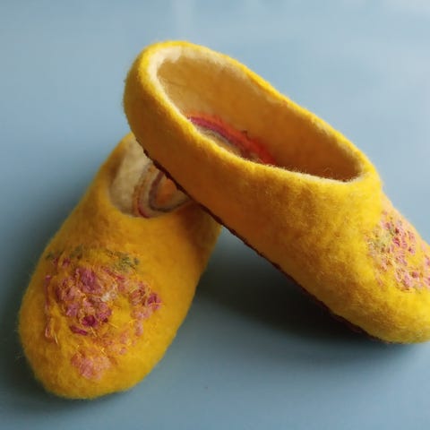Käsin tehdyt huopatossut pikku prinsessalle. Kevyet ja lämpimät. Sisämitta 13 cm.