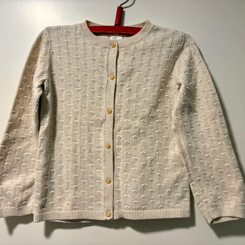 Punainen nätti neuletakki kokoa 100 cm ja suunnilleen samaa kokoluokkaa vaaleanharmaa vetoketjullinen ja taskullinen huppari 110 cm.