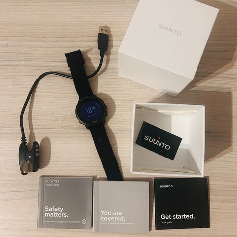 Suunto 3 urheilukello. Kellossa on tummanruskea ranneke ja mukana USB-latauskaapeli. Sopii aktiiviseen käyttöön ja urheiluun