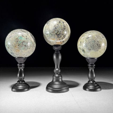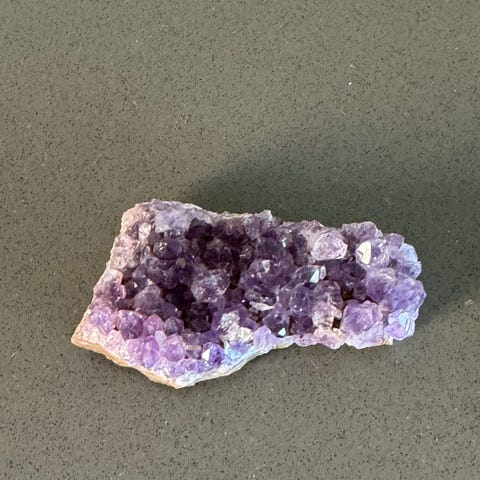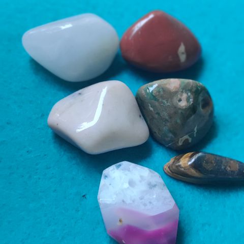 Akaattipallon puolikkaat, ametistipala, hematiittikvartsi, valkoinen fluoriitti ja ametisti klusteri