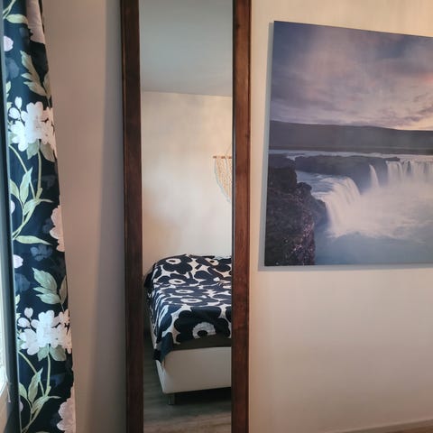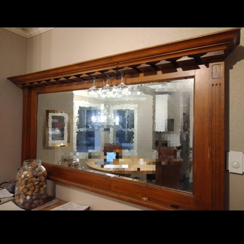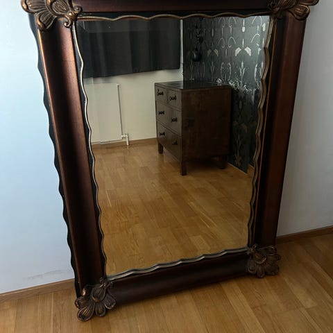 Massiivinen, painava puinen peili. 112,5 x 71,5.