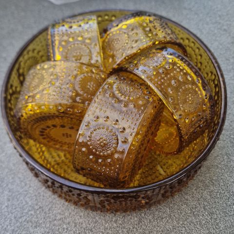 Nanny Stillin Riihimäen lasille suunnitteleman Grapponia-sarjan vihreä annoskulho. Myynnissä olevat kulhot ovat ehjiä ja muutenkin hyväkuntoisia.