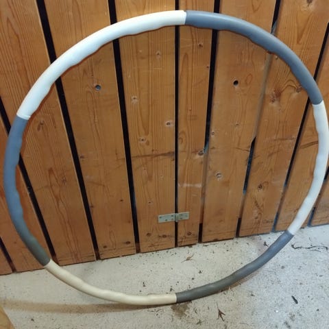 Hulavanne on nyt purettuna ja se kootaan laatikon päällä olevan kuvan mukaisesti. Vanne on kevyt ja painaa vain 300 grammaa. Vanne voidaan koota 71 cm pitkäksi tai 81 cm:n pituiseksi.